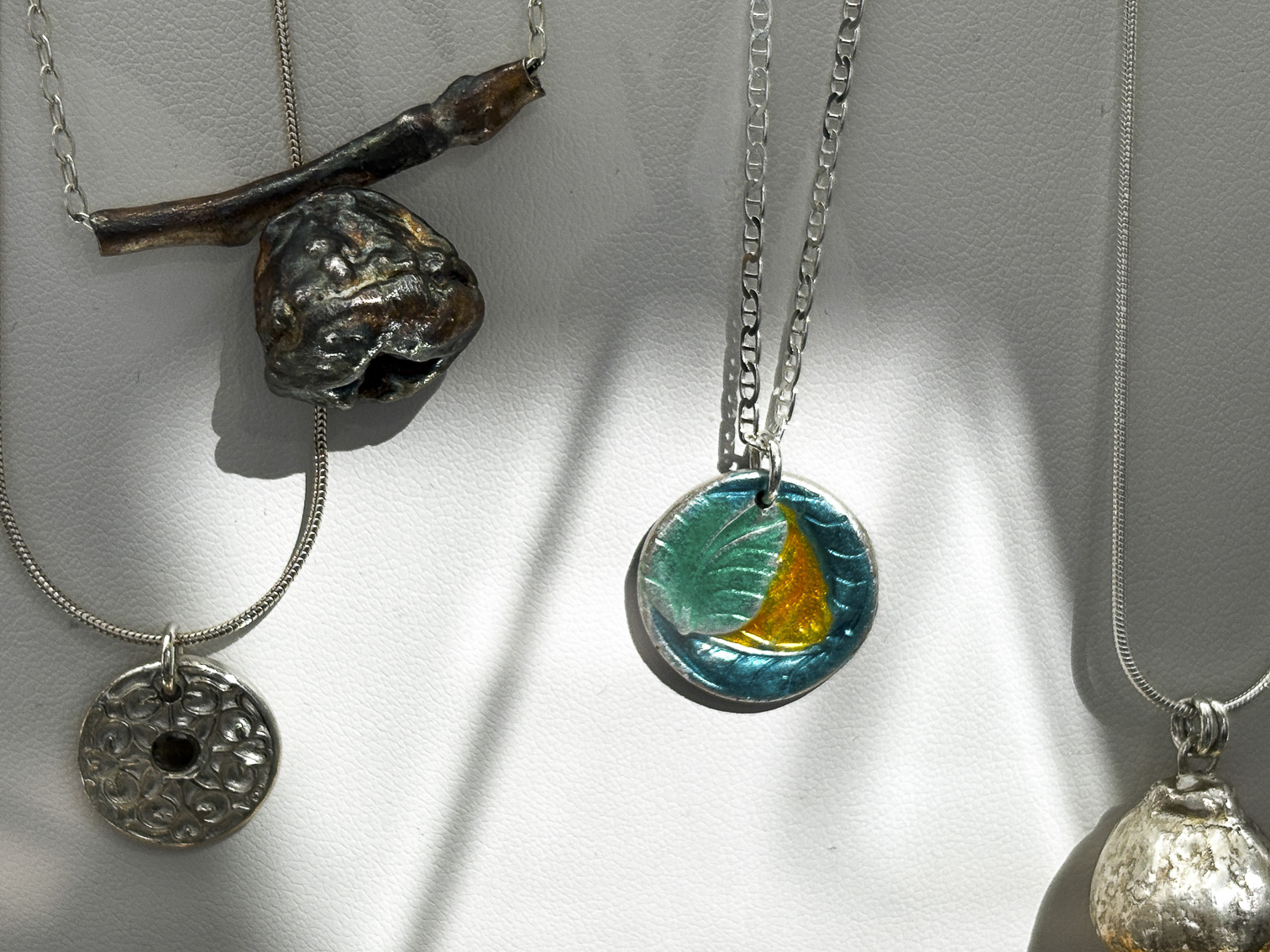 Resa enjoys taking leaves, twigs, and other found objects and transforming them into fine silver jewelry. Additionally, she likes hammering and reticulation of silver into unique works. Resa loves going to different gem and mineral shows, looking for unusual stones and other items to incorporate into her work.